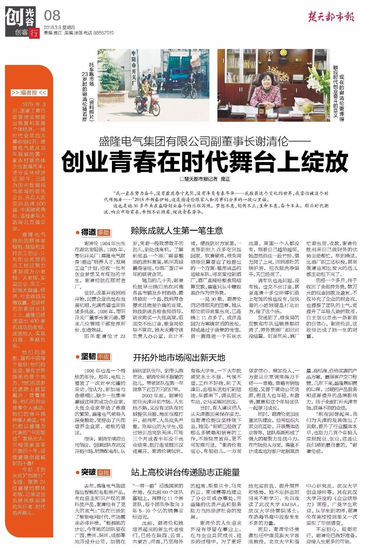 转自3月8日《楚天都市报》报道编者按1979年3月,国家工商行政管理总局提出恢复和发展个体经济,一场时代变革的大幕徐徐拉开。盛隆电气就从当年我省的第一家农村联合体企业发展而来,坚守实体经济近39年,已成为国内智能用电领域的领先企业,先后入选亚洲品牌500强、中国驰名商标,连续多年入选湖北百强企业。盛隆电气独创的...2018-03-20 -