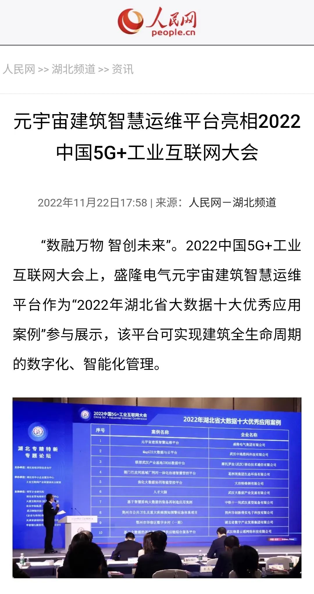 【媒体聚焦】盛隆电气元宇宙建筑智慧运维平台亮相2022中国5G+工业互联网大会“数融万物 智创未来”。11月19日,2022中国5G+工业互联网大会在中国光谷科技会展中心盛大开幕。盛隆电气元宇宙建筑智慧运维平台作为“2022年湖北省大数据十大优秀应用案例”参与展示,自主研发的智能配电柜iPanel同时亮相此次展会。人民网、新华社、中新社、湖北日报、湖北电视台、湖北发布、长江云、长江日报、极目新闻...2022-11-23
