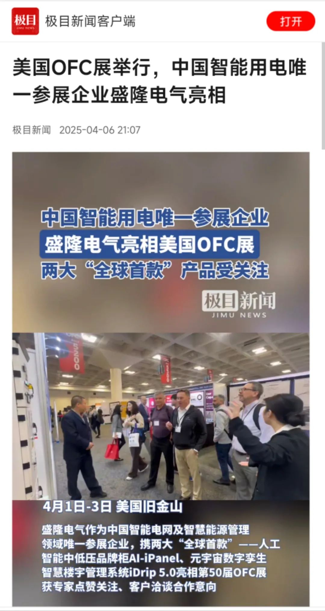 当地时间4月1日,全球光通信领域顶级盛会——第50届光网络与通信研讨会及博览会(OFC)在美国旧金山莫斯科尼会展中心开幕。盛隆电气作为智能用电龙头企业参展,并在会上发布由新华社拍摄的国际版宣传片。2025-04-03
